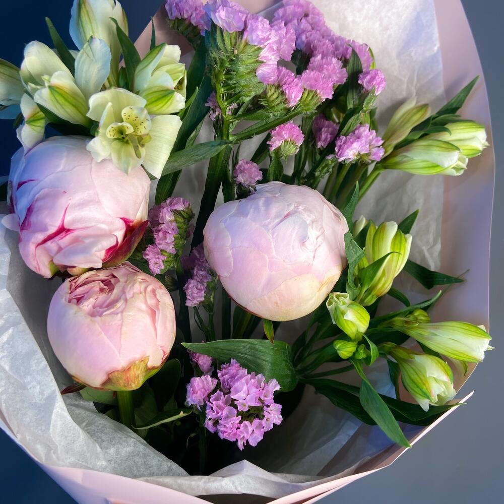 Весенний букет с красивыми розовыми пионами ,веточкой розовой старицы и соцветиями белых алстромерий При раскрытии пионы станут намного больше,имеют махровую сердцевинку. А соцветия белых альстромерий со временем раскроются и буду дарить свою красоту не одну неделю !По истине притягательный и долговечный букет! Каждый цветок отбирается нашими профессиональными флористами с заботой и любовью,для того чтобы вы долго ими наслаждались!К каждому букетику мы обязательно прикладываем подкормку для срезанных цветов и надёжно их упаковываем для транспортировки получателю