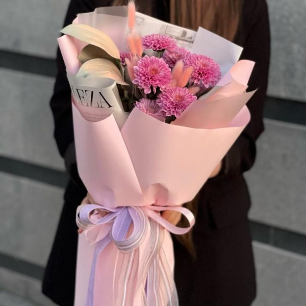 Такой букет станет великолепным подарком для близкого человека, символизируя знак внимания и заботы. Он украсит любой праздник, напоминая о том, что в простоте кроется настоящая красота. Каждый взглянув на него, ощутит тепло и душевное спокойствие. Фиолетовый цвет хризантемы символизирует мудрость, благородство и достоинство. Этот цвет также ассоциируется с роскошью и изысканностью.