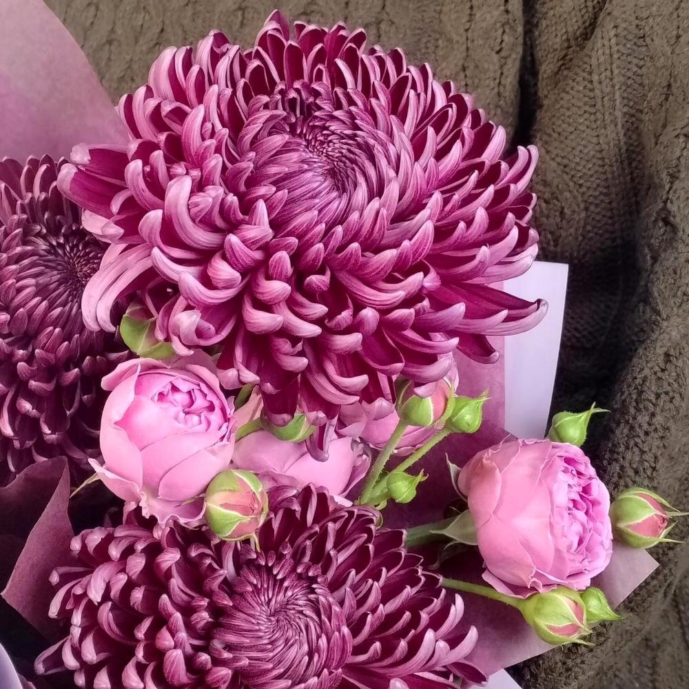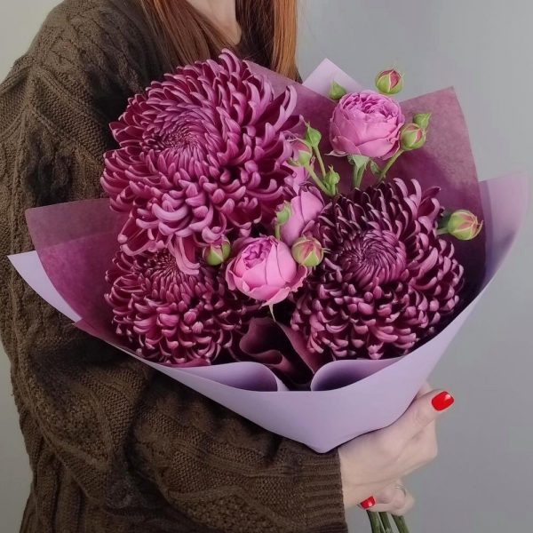 Букет из кустовых хризантем сорта бигуди винного цвета и розы сорта мисти баблс.