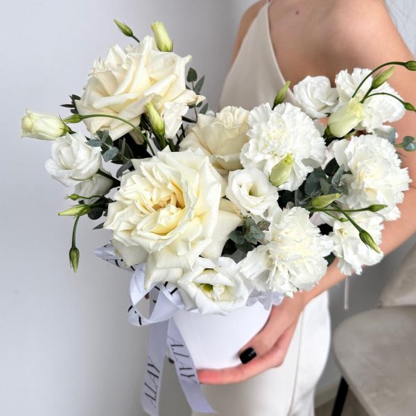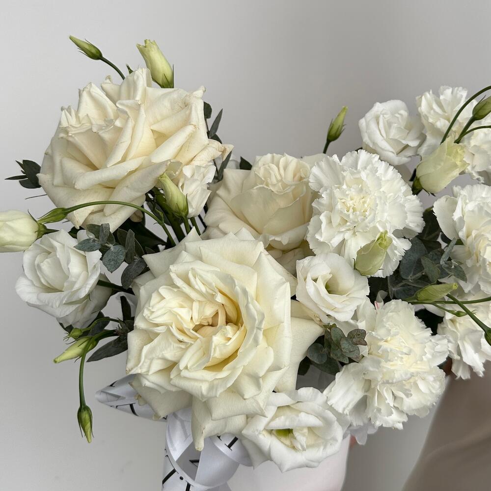 Розы, эустома и диантусы в коробке в Осташкове