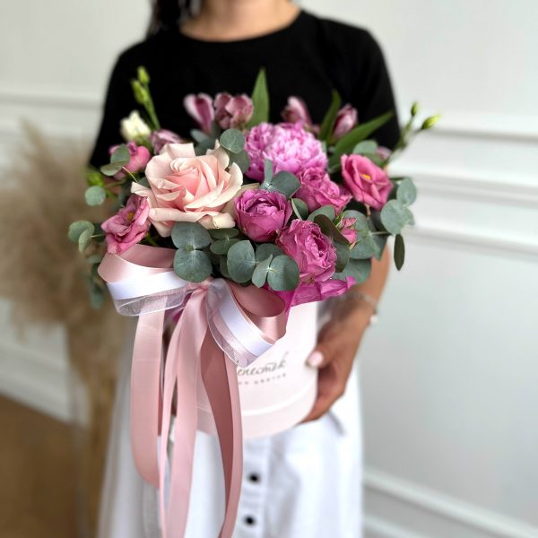 Шляпная коробка 15см, Лента атласная, Целлофан , Флористическая губка (Оазис), Стильная упаковка, Роза по французски, Кустовая, пионовидная роза Misty Bubbles (Мисти Баблс), Пион Сара Бернар( Paeonia 'Sarah Bernhardt'), Альстромерия, Эвкалипт цинерея, Эустома Алиса Пинк