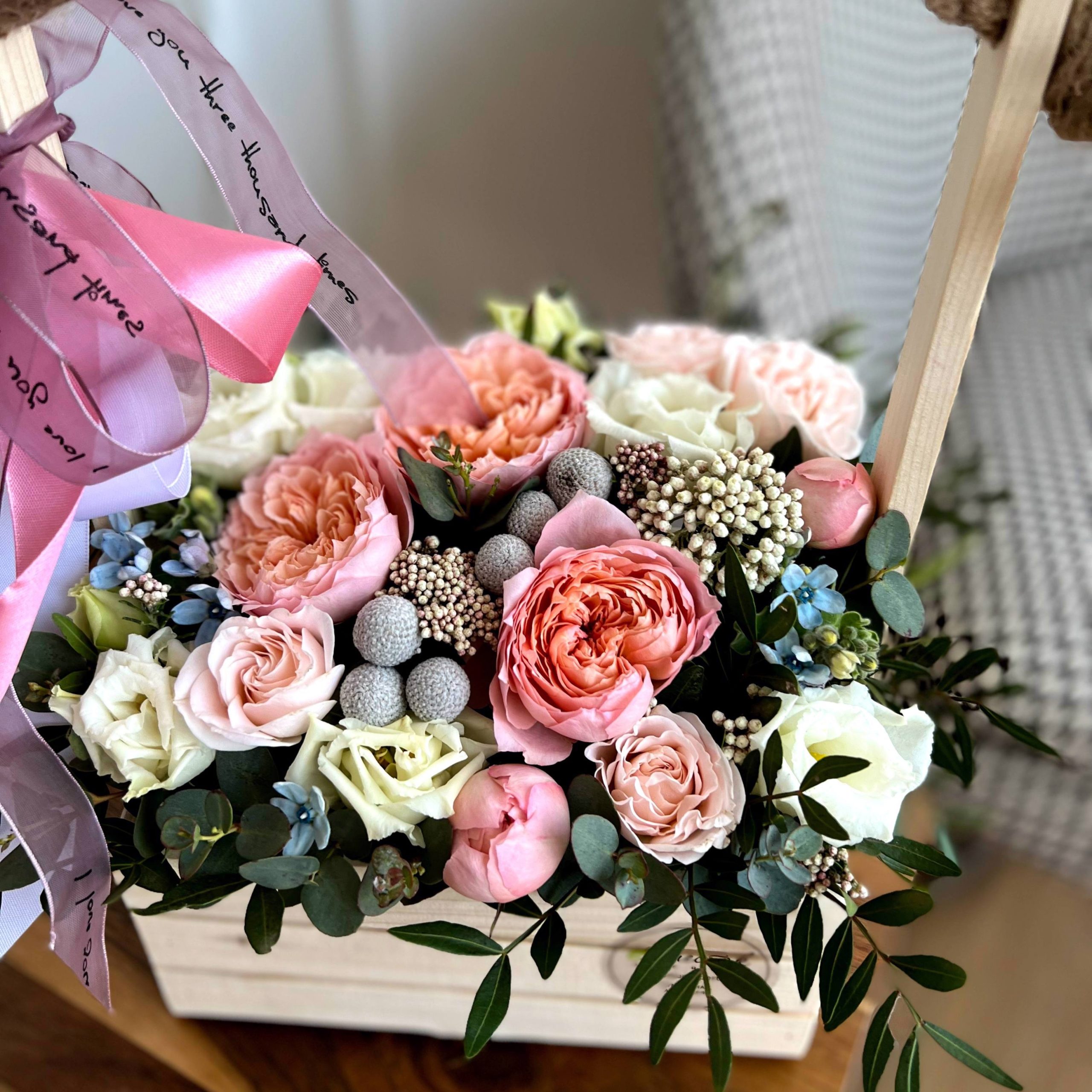 Деревянный ящик с пионовидными розами, твидией и озотамнусом в Осташкове
