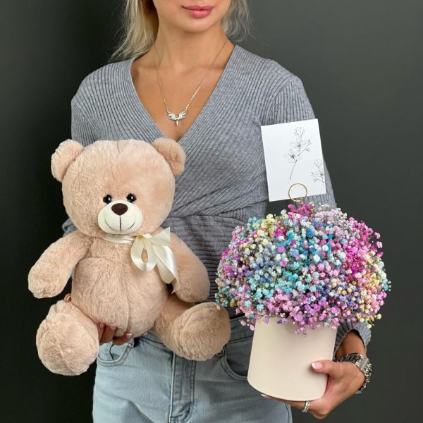 Мягкая игрушка мишка и радужная гипсофила в Осташкове